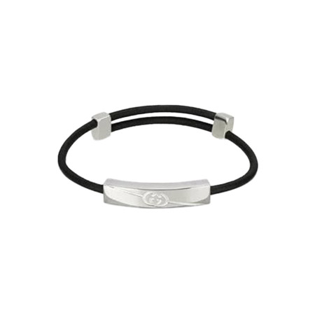 This Gucci bracelet is made of black leather with a 925 sterling silver detail featuring a diagonal engraving of the interlocking G logo secured with a sliding closure.