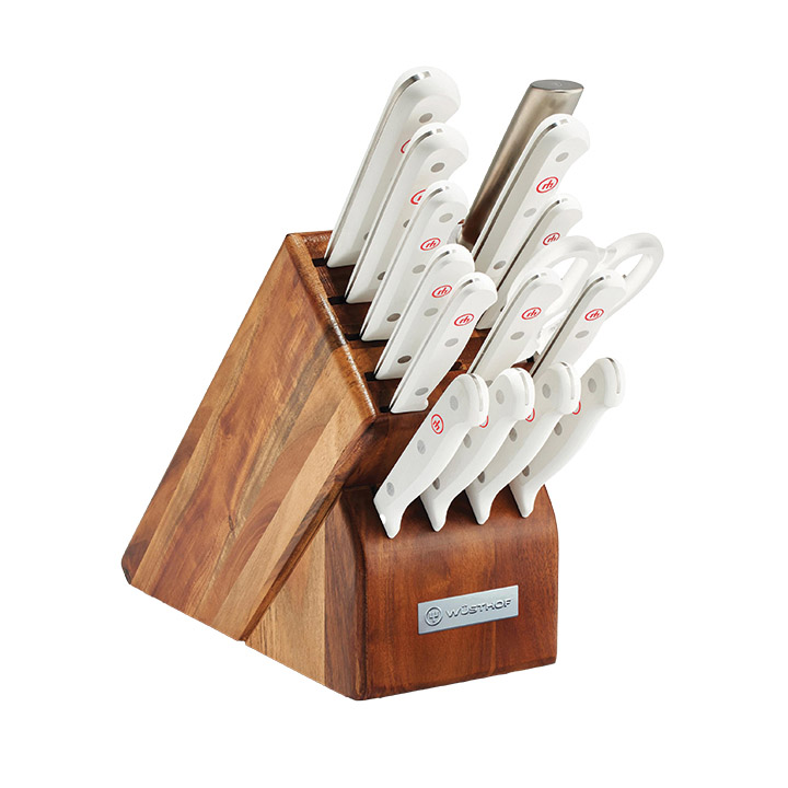 The Wusthof Gourmet Knife set offers superb value and premium quality. It’s the perfect knife set for getting started in your kitchen. The attractive white handles and wooden knife block will look as good on your counter as they do on the table.