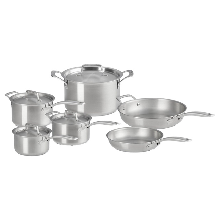 Le Creuset's Essential Stainless Steel 10-Piece Cookware Set is expertly crafted for the everyday cook and engineered for performance, style and lasting quality. Innovative details such as interior capacity markings and a dripless pouring rim save valuable prep time and make cleanup a breeze. This set of 10 includes a 9.5" Frying Pan, 11" Frying Pan, 2 -quart Saucepan with Lid, 3 -quart Saucepan with Lid, 4 -quart Saucepan with Lid, 4 -quart Stockpot with Lid.