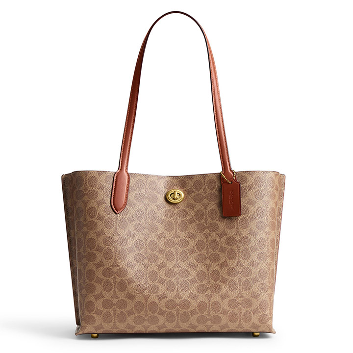 Not too big, not too small, Willow is the perfect carry-it-all tote with space for all of your day-to-day essentials. Crafted of Coach Signature canvas and refined leather, it features two open pockets, a secure center zip compartment and slender shoulder straps designed with a longer drop to fit comfortably over coats. Finished with their iconic Signature turnlock closure, it fits up to a 13 inch laptop.