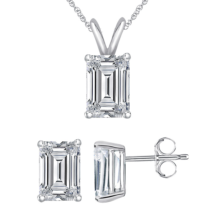 This emerald-shaped lab-grown diamond pendant set includes a pendant necklace on a 10K white gold chain and matching earrings each at 0.45 carat. All of the stones feature glorious clarity and color.