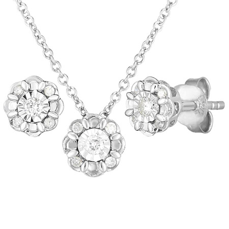 This diamond earring and necklace set features urban style and diamond dazzle to celebrate the circle of a life well-lived. The pieces feature .04 total carats of round diamonds set in sterling silver circles, and the pendant hangs from an 18” round snake chain.