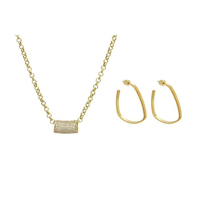 Dean Davidson's signature Pave Tube Necklace and Square Hoops will keep the compliments rolling in. The necklace features a tubular charm set with pave-cut white topaz strung on a statement-making rolo chain. The square-shaped hoops with their slim, lightweight structure makes wearing this style effortless. They are cast out of the highest quality brass and then plated in 22KT gold.