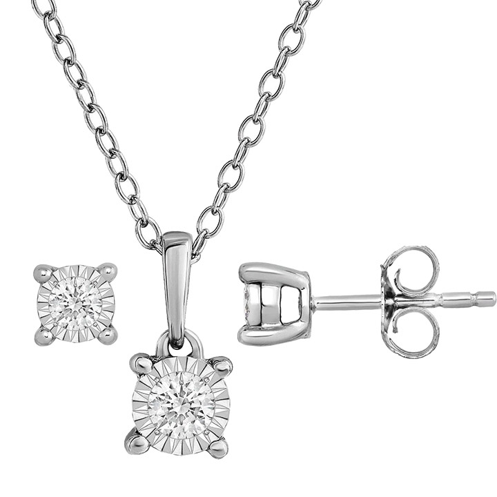 This classic is one to which you will not be able to say no. The classic diamond solitaire earrings and necklace set in sterling silver are simple, stunning, and dazzling. The diamonds are 0.30twt round brilliant-cut and set in sterling silver on an 18" cable chain.