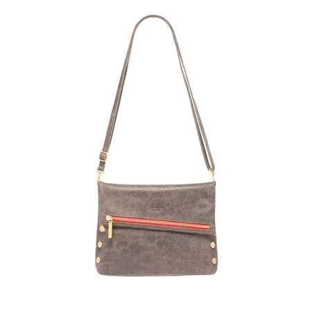 Feel like a VIP with Hammitt's all-time best-seller in pewter leather. It features an optional strap and elevated brushed gold rivets. Plus, you'll find a subtle strip of luxe red peeking out along the bag's back seam. Crafted with distressed yet smooth pewter leather, brushed gold hardware, you can wear it three ways: Crossbody, Clutch or Shoulder Bag.