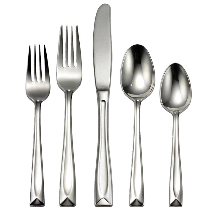 The Lincoln 65-piece flatware set from Oneida is designed for those who appreciate a minimalist, no-nonsense approach. It is made of 18/0 stainless steel with a mirror polished finish and is dishwasher safe. In addition to twelve 5-piece place settings (containing a dinner fork, salad fork, dinner knife, dinner spoon, and teaspoon) the set includes a serving fork, serving spoon, pierced serving spoon, butter knife, and sugar spoon.