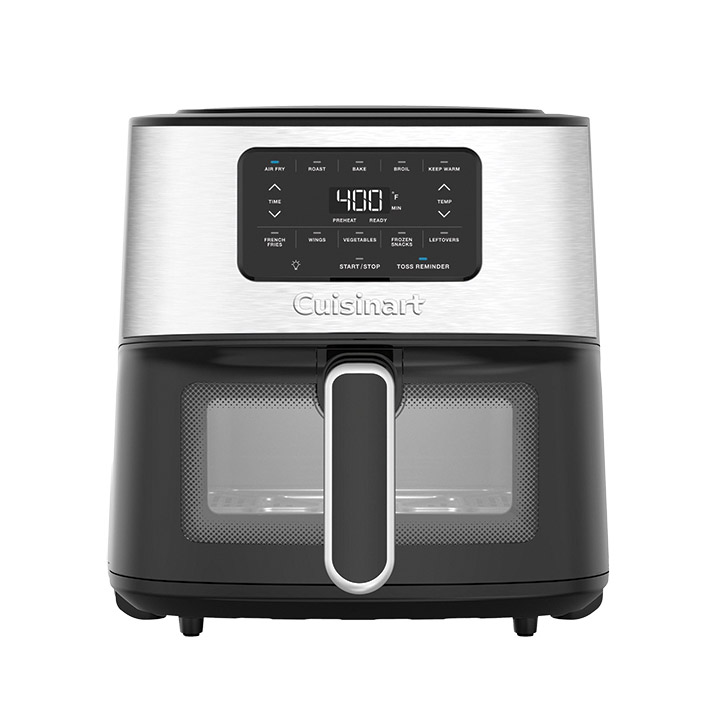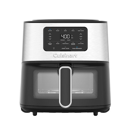 The Cuisinart Basket Air Fryer includes five pre-programmed settings making it easy to fry, roast, bake, broil, or warm everything from simple snacks to main meals. Dimensions: 14.5" x 12.25" x 12" includes ceramic, nonstick, dishwasher safe easy-clean crisper basket.