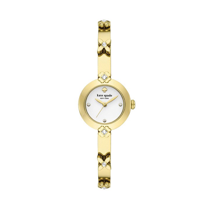This women’s Monroe bracelet watch is both bracelet and timepiece, with a gold-tone stainless-steel bracelet with flower details, glossy white dial with gold three hands and three sparkling hour markers, a signature gold-tone Kate Spade logo at 12:00, and a gold-tone stainless-steel 24mm case and bezel. Water resistant to 30M.