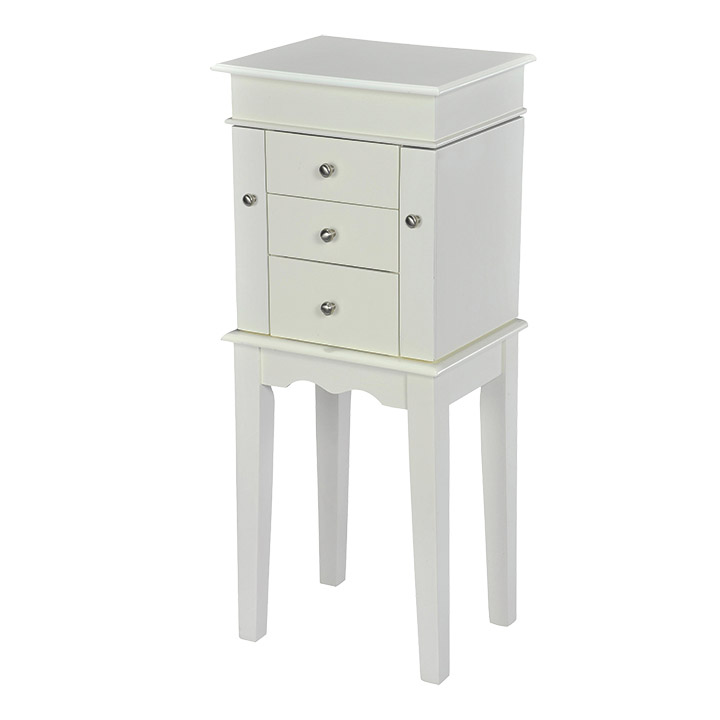 Store all your favorite jewelry pieces in a safe and protective way with this jewelry armoire cabinet organizer from W Unlimited. Lined with plush felt, this three-drawer armoire feature a central ring roll section and dual necklace doors. The smooth finish and lift-up top reveal a mirror to give the piece an elegant look. Measures 31.75” x 13” x 10”.