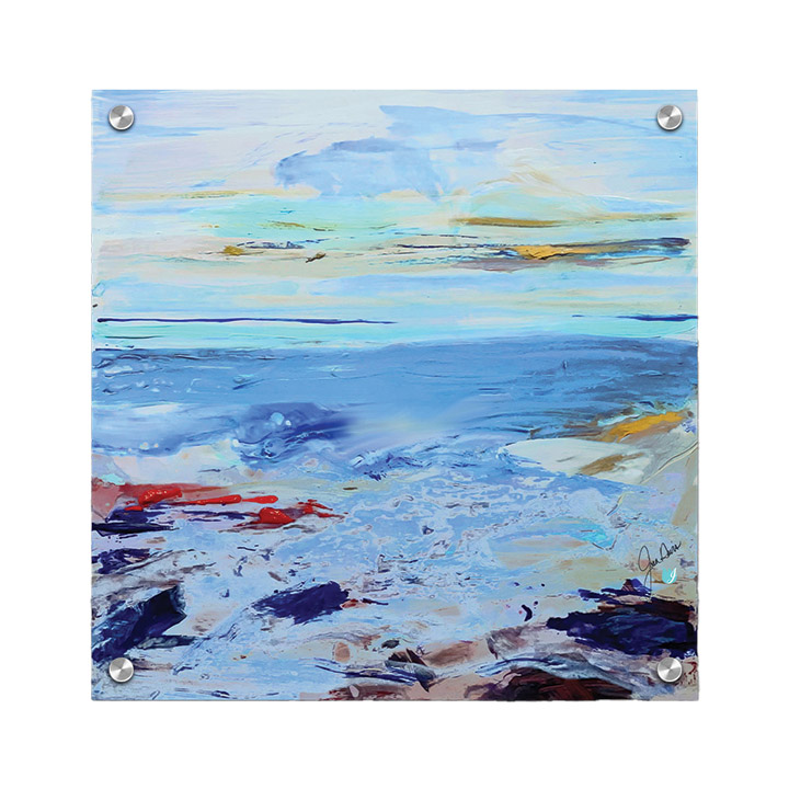 Experience the beauty of the coast with “Textured True Blue” by JD Studio, an abstract landscape painting that features thick layers of pain for texture and depth. The image is printed on acrylic sheets, which have a stunning, seek appearance, are ΒΌ” thick and come with silver standoff screws and installation instructions. Measures 20” x 20”.