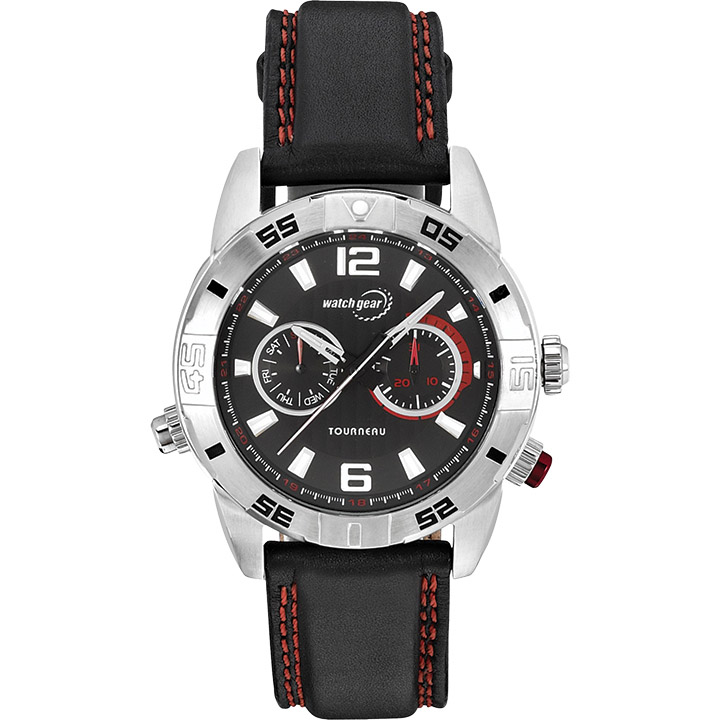 This sporty men’s watch from Watchgear by Tourneau will go with just about anything. It features a 43mm stainless-steel case, a black sunray dial with day and date subdials, Swiss quartz movement, and a black padded leather strap with red contrast stitching. Water resistant to 330 feet.
