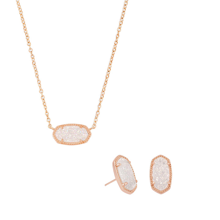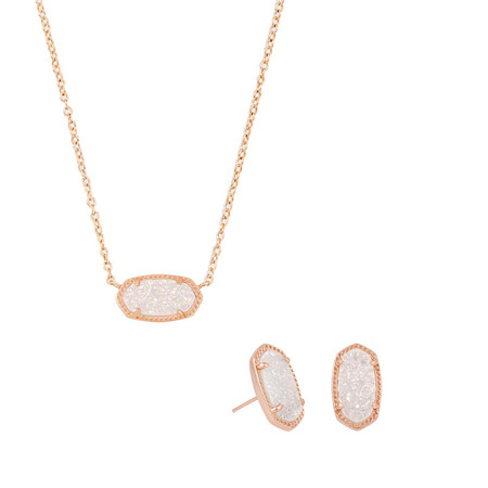 This timeless and classic Kendra Scott bundle in rose gold with iridescent drusy includes the Elisa rose gold pendant necklace, bringing an extra touch of timeless style, and matching Ellie stud earrings for a subtle take on a signature style. The pendant measures 0.63” x 0.38” on a 15” chain with a 2” extender, and the earrings measure 0.69” x 0.38”.