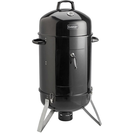 Now you can smoke all of your favorite foods with the Cuisinart vertical 18" charcoal smoker. With two round 18" cooking grates that can be stacked inside the smoking chamber, this smoker can accommodate just about any foods you want to smoke. Includes removable lid with temperature gauge; width: 25" height: 45" depth: 25" weight: 25-pounds.