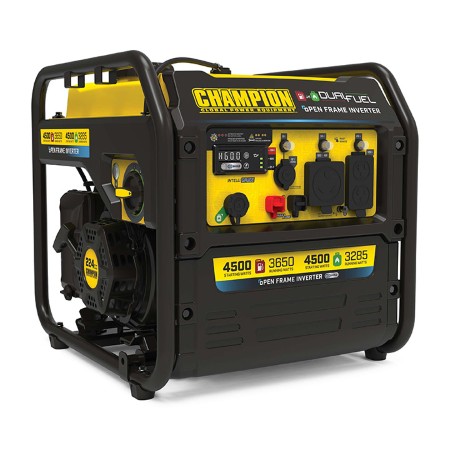 The Champion Power Equipment 4500-Watt Dual Fuel Open Frame Inverter Generator with CO Shield® is perfect for camping, tailgating, RV use, or as a reliable backup for home essentials.Our Quiet Technology reduces noise, while the efficient design minimizes size and weight. The 224cc Champion engine delivers 4500 starting watts and 3650 running watts on gasoline, running for 22 hours at 25% load with a full 4.02-gallon tank. On propane, it offers 4500 starting watts and 3285 running watts, with a runtime of 21 hours at 25% load using a 20-pound tank. A 6-foot propane hose with a built-in regulator is included.This generator features covered outlets: a 120V 30A RV outlet (TT-30R), a 120V 20A (5-20R) household duplex outlet, and a 12V automotive-style outlet. With the optional Parallel Kit (sold separately), you can connect two compatible Champion inverters for increased output.The Quick Touch Panel provides easy access to controls, while the Intelligauge with Power Meter helps you monitor voltage, frequency, and operating hours. Economy Mode adjusts engine speed based on power consumption, extending run times and enhancing fuel efficiency.EPA-certified, this inverter generator comes with a 3-year limited warranty, FREE lifetime technical support, and access to our nationwide service centers, ensuring peace of mind with every purchase.CO Shield technology monitors the accumulation of carbon monoxide (CO), a poisonous gas produced by engine exhaust when the generator is running. If CO Shield detects unsafe elevated levels of CO gas, it automatically shuts off the engine. CO Shield is not a substitute for an indoor carbon monoxide alarm or for safe operation. DO NOT allow engine exhaust fumes to enter a confined area through windows, doors, vents or other openings. Generators must ALWAYS be used outdoors, far away from occupied buildings with engine exhaust pointed away from people and buildings. Meets the requirements of ANSI/PGMA G300.