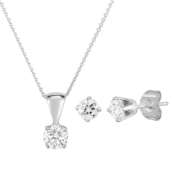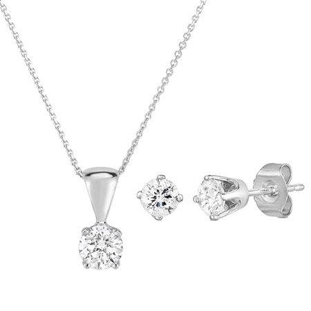 This diamond earring and necklace set features urban style and diamond dazzle to celebrate the circle of a life well-lived. The pieces feature .04 total carats of round diamonds set in sterling silver circles, and the pendant hangs from an 18” round snake chain.