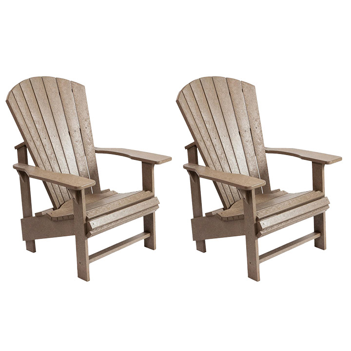 This package includes 2 upright Adirondack chairs that have higher arms and a raised, less sloped seat. These chairs are constructed from up to 100% recycled, heavy 7/8" gauge plastic lumber and are ergonomically designed. They include all stainless steel hardware, are completely waterproof, and require no painting. Dimensions: 44" x 31" x 27"; Seat Height 17".