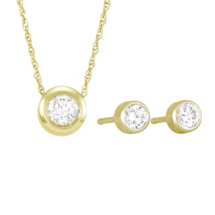 The Antwerp Diamonds Royal Bezel Set Earrings and Necklace combination make a perfect gift. Timeless, beautiful royal bezel set earrings are set in a classic bezel setting in 14K gold. These include 2 brilliant 0.05 carat diamonds, totaling 0.10 carats. While our bezel set necklace radiates in a classic 14K gold, bezel setting set with a 0.05 carat brilliant cut diamond.