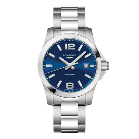 The ultimate everyday watch, the Conquest from Longines exudes a harmonious blend of audacity, contemporary design and sporty elegance. The 41mm stainless steel case with sunray blue dial and silver polished hands is a handsome look. It features Arabic numerals, indices, and date window at the 3 o'clock position set on a stainless steel bracelet.