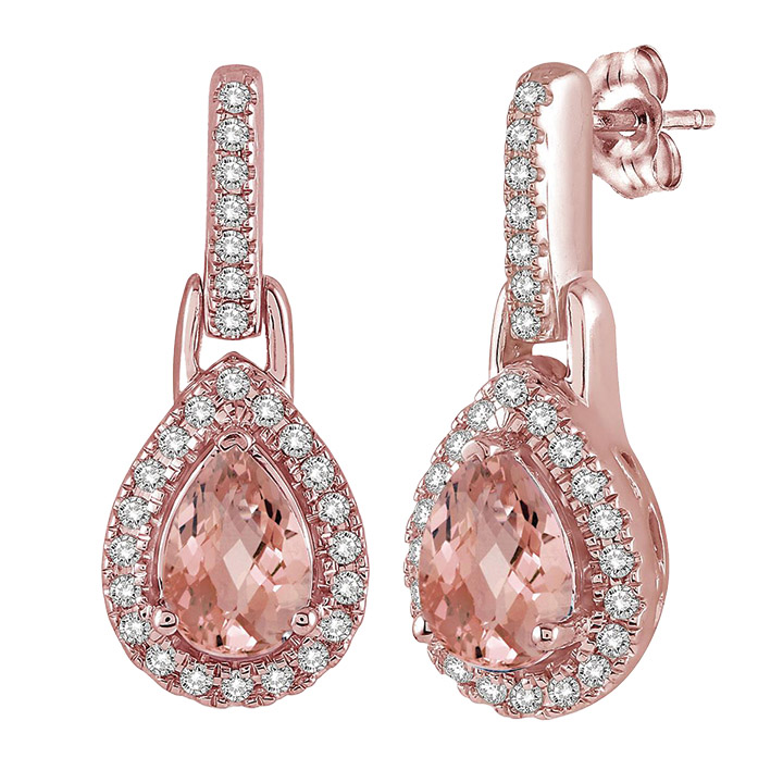 Shimmering, peachy-pink 6x4mm pear-shaped genuine morganites are elegantly complemented by 10K rose gold surrounded by a stunning halo of 0.20twt round diamonds. Wear some rose gold radiance on your next night out.