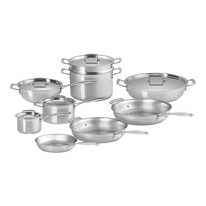 The Classic Stainless Steel 14-Piece Cookware Set from Le Creuset combines long-lasting durability with exceptional performance for the passionate cook looking to level up. The satin matte exterior, blended with polished accents, resists scratches, marks and fingerprints. The set includes: a 9.5" fry pan, 11" fry pan, 12.5" fry pan, 3.5-quart chef's pan with lid, 1.5-quart saucepan with lid, 3-quart saucepan with lid, 5-quart braiser, and 7.25-quart pasta pot with sieve insert and lid.
