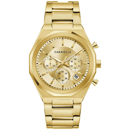 Caravelle’s men’s bracelet watch will add a touch of glamour to any outfit. The case and bracelet are made of gold-tone stainless steel, and the watch has a champagne dial with a date window and several subdials.