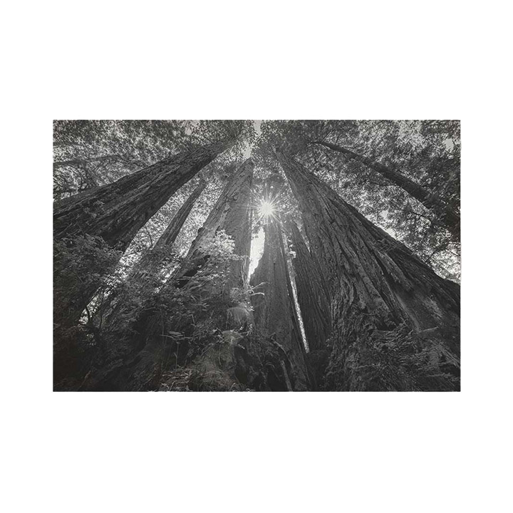 “Among Giants” is a stunning piece of black and white photography by Scott Barlow, capturing the majesty and grandeur of the towering redwood trees in Redwood National Park, California. The artwork is printed on 100% cotton canvas and stretches over 2” wide bars, with edges printed with a mirror image of the artwork. Measures 30” x 45”.