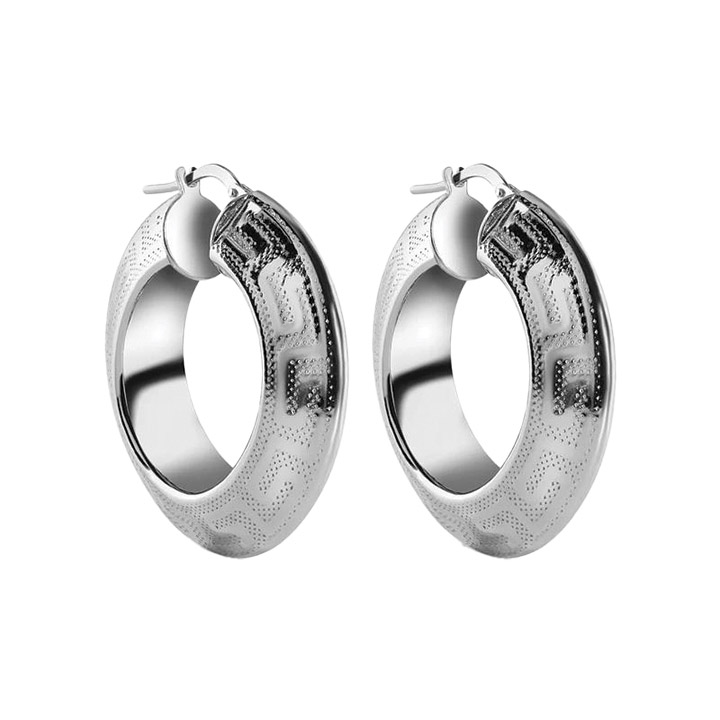 These Greek key latch earrings feature a classic geometric design in rhodium plating over 925 sterling silver for lasting shine and durability. Measuring 20mm in diameter and 8.3mm x 7mm thick, they offer a bold yet refined look that complements any style.