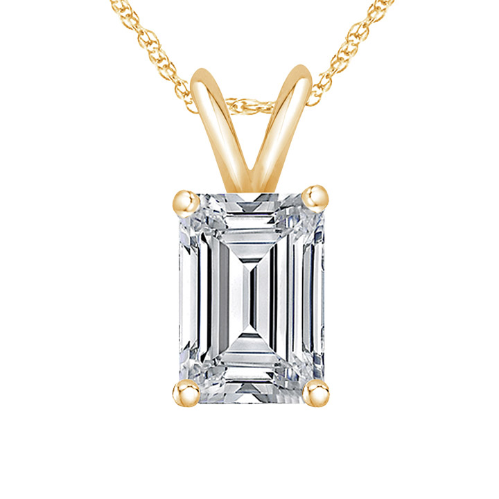 This beautiful, elegant and classic emerald-shaped lab-grown diamond pendant from Parikhs is suspended from a 10k yellow-gold chain. This necklace will glimmer from your neck! The diamond is 0.18-carats with EF color and VS2 clarity.