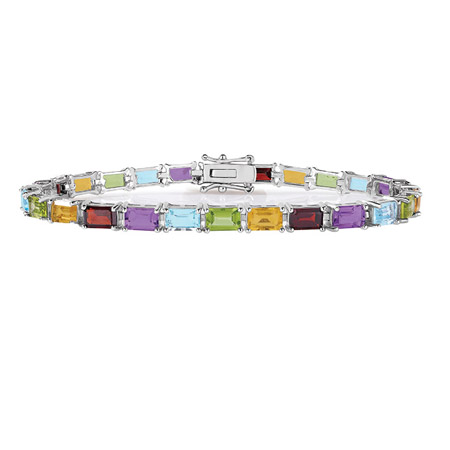 Give your style a colorful and charismatic boost with this stunning genuine multi-gemstone baguette-link bracelet in high-shine sterling silver with a box clasp. The bracelet includes amethyst, blue topaz, citrine, garnet, and peridot that measures 6mm x 4mm. The total length is 7.25”.