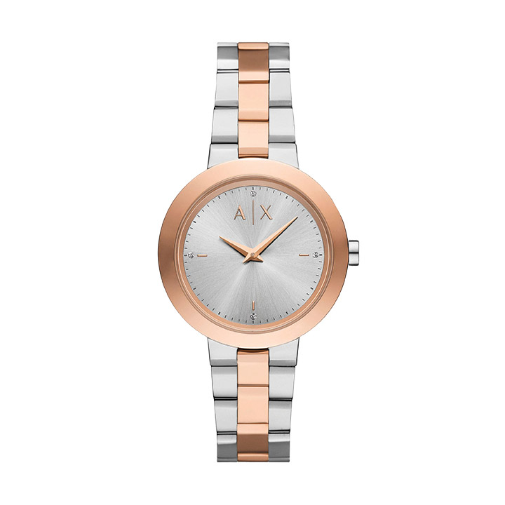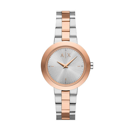 This women’s Jackie watch from Armani Exchange exhibits a classic look in two-tones, with a rose gold and silver-tone stainless-steel bracelet, bezel, and 36mm case. It features a silver-tone sunray dial with four crystal and stick hour markers, two rose gold-tone hands, and an AX logo. Water resistant to 50M.