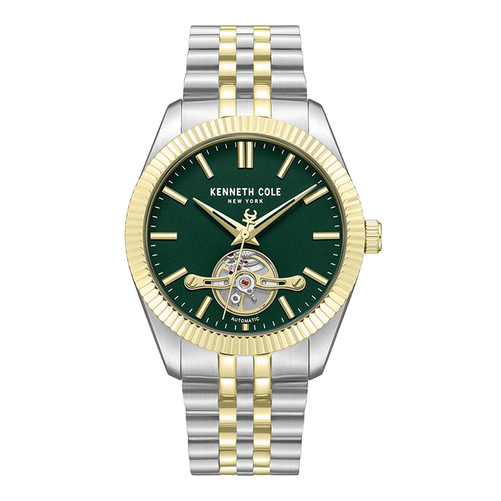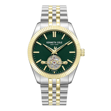 Kenneth Cole’s automatic watch combines style and mechanics in one striking package. It has a clean, dark green dial with sleek line hour markers for modern minimalism, with a small viewing window at 6:00 that reveals the mesmerizing inner mechanics in motion. The gold-plated coin-etched top ring frames the dial with sharp detail. The case measures 43mm.