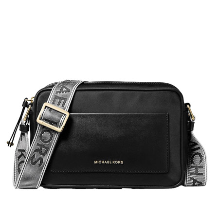 The Jet Set crossbody bag from Michael Kors offers a sporty twist on the classic style, crafted from sleek nylon gabardine with polished gold-tone hardware. It features a woven crossbody strap adorned with brand lettering, ideal for on-the-go adventures, with an adjustable strap ranging from 15” to 26”. It has multiple pockets on the interior and exterior and fastens securely with a zip closure.
