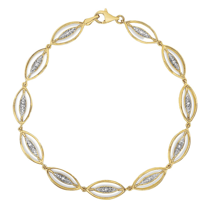A timeless bracelet with a twist, this piece features open oval links made of sterling silver with yellow-gold overlay that intersect with diamond-encrusted bar links to create an eye-catching, leaf-like motif. The contemporary design is handmade by Turkish artisans and measures 7.5” with a lobster-claw clasp.