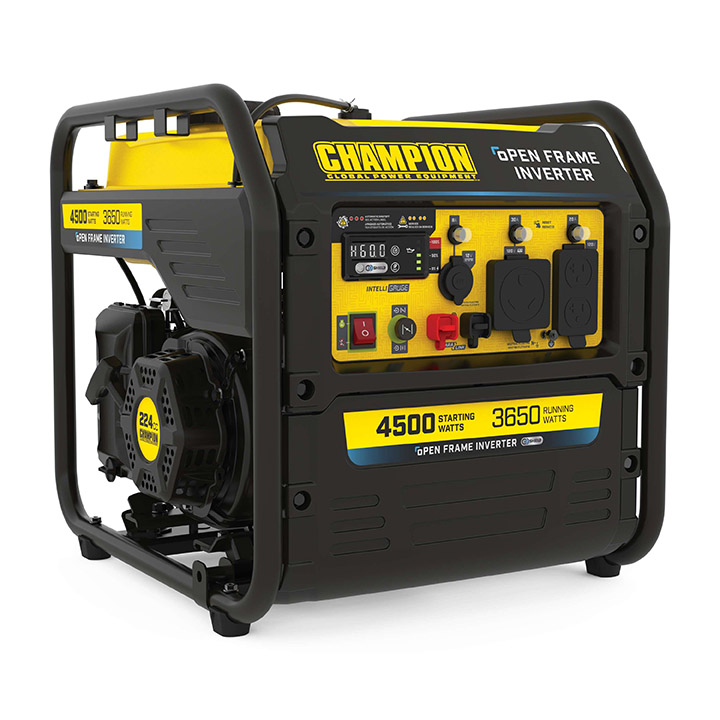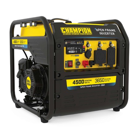 The Champion Power Equipment 4500-Watt Open Frame Inverter Generator with CO Shield® is one of the most innovative products on the market. Our advanced technology and innovative design will improve the way you power your life.First, we cut the noise level in half by integrating Quiet Technology digital components used in more advanced inverters. Then, we created an efficient mechanical design to decrease the overall footprint and weight by 20 percent. A quiet, lightweight addition to your RV and a cost-effective power solution, this Open Frame Inverter is smaller, quieter, lighter…BETTER!Champion's recoil start features Cold Start Technology, plus the reliable 224cc Champion engine produces 4500 starting watts and 3650 running watts, and runs for 22 hours at 25% load when the 4.02-gallon fuel tank is full.With a 0.6-quart oil capacity (included 10W-30) and a low oil shut-off sensor, this inverter operates at 64 dBA from 23 feet, which is a bit louder than normal speech.Confidently connect your sensitive electronics since this inverter produces Clean Power (less than 3% THD).Our Quick Touch Panel offers fast access to all your controls. The Intelligauge with Power Meter monitors voltage, frequency and operating hours with ease, while Economy Mode monitors power consumption in real time to reduce electrical load. As the electrical load is reduced, the engine idles lower, providing quieter operation, extended engine life and higher fuel economy.The covered outlets in this RV Ready inverter include a 120V 30A RV (TT-30R), a 120V 20A household duplex outlet (5-20R) plus a 12V automotive-style outlet.The optional Parallel Kit (sold separately), with included standard 50-amp RV outlet, provides a clip-on connection which allows you to connect with another Parallel Ready Champion Inverter or Power Station for more power and longer run time.Buy this fully assembled EPA certified generator with confidence – Champion Support and our nationwide network of service centers will back up your purchase with a 3-year limited warranty and FREE lifetime technical support.CO Shield technology monitors the accumulation of carbon monoxide (CO), a poisonous gas produced by engine exhaust when the generator is running. If CO Shield detects unsafe elevated levels of CO gas, it automatically shuts off the engine. CO Shield is not a substitute for an indoor carbon monoxide alarm or for safe operation. DO NOT allow engine exhaust fumes to enter a confined area through windows, doors, vents or other openings. Generators must ALWAYS be used outdoors, far away from occupied buildings with engine exhaust pointed away from people and buildings. Meets the requirements of ANSI/PGMA G300.