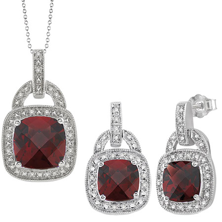 Crafted in luminous sterling silver, this garnet earring and necklace set features centrally staged cushion-cut garnets that are gracefully complemented by single-cut diamonds in pave settings. The earrings feature 8mm stones and the necklace features a 10mm stone on an 18" cable chain.