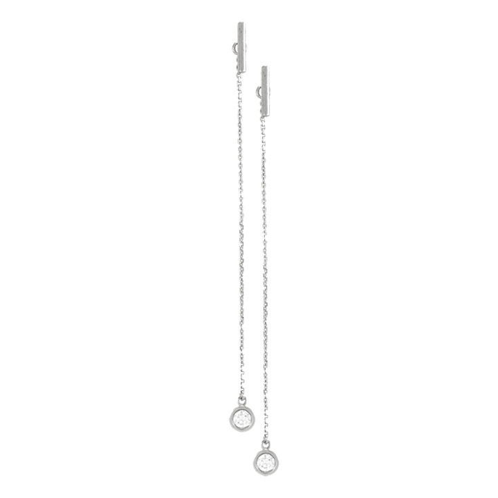 The Antwerp Diamonds' Bezel Drop earrings are a high fashion look in 14K white gold. The two bezel-set round brilliant cut 0.16twt diamonds dangle 2.25 inches from your ear for a truly eye-catching accent.