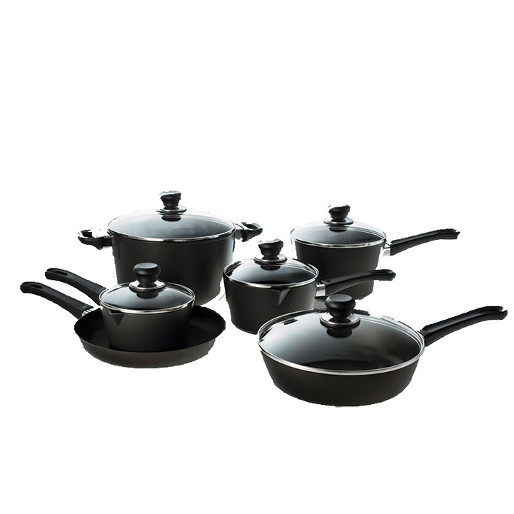 Featuring the most extensive range of nonstick cookware shapes and styles on the market, the Scanpan classic is a timeless cookware line designed for everyday use in every home. Made with oven-safe rivetless Bakelite handles and a lightweight construction, use the extensive range of shapes to create any meal you can imagine. This 11-piece set includes: 10.25” fry pan, 2.75-quart, covered sauté pan, 1.25-quart covered saucepan, 2-quart covered saucepan, 3.25-quart covered saucepan, and a 7-quart covered Dutch oven.