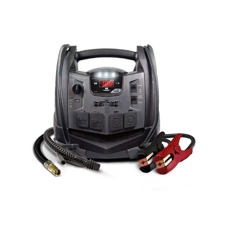 Schumacher Electric’s 1200-peak Amp portable power jump starter has an on/off switch that activates the jump-start mode. Just connect an extension cord to the plug to recharge; the battery status LED will tell when a battery is charged or needs to be charged. The Sure-Grip clamps fit both top- and side-mount batteries and the cable will stay flexible in the coldest weather.