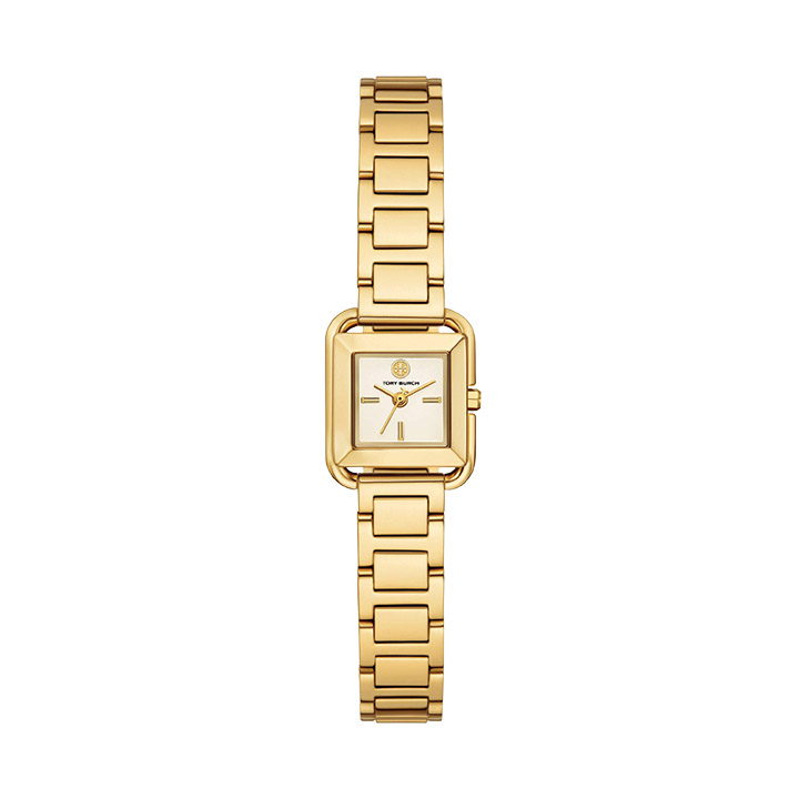 The Mini Kira watch from Tory Burch features a gold-tone stainless steel H-link bracelet bezel and case with an ivory square dial. The case measures 18mm x 18mm x 6.6mm and has a 12mm bracelet.