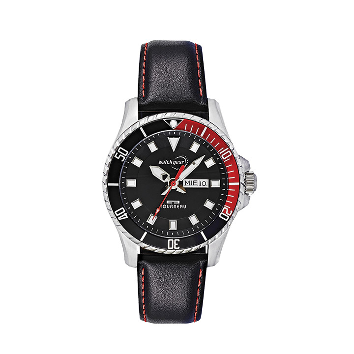 This sporty men’s watch from Watchgear by Tourneau will go with just about anything. It features a 43mm stainless-steel case, a black sunray dial with day and date subdials, Swiss quartz movement, and a black padded leather strap with red contrast stitching. Water resistant to 330 feet.