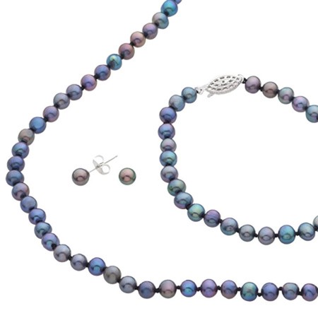 Classic and timeless, this lovely pearl set adds a touch of sophistication to any look. It features 5-6mm black freshwater pearls with sterling-silver filigree clasps. The earrings are secured with post backs, while the bracelet measures 7” and the necklace measures 18”. This is a must-have set for dressing up jeans or a little black dress.