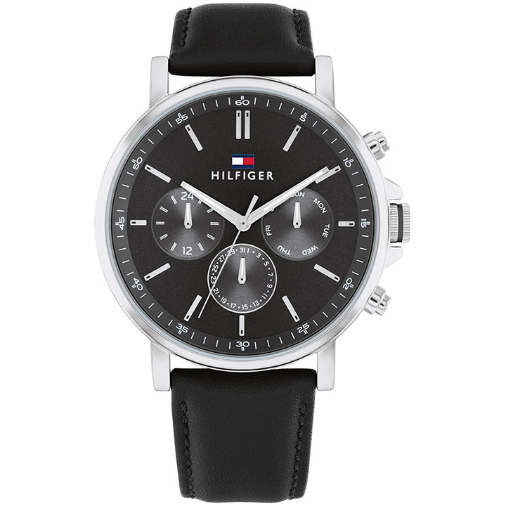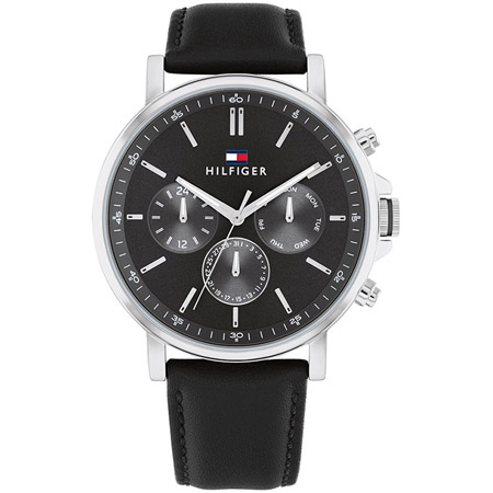 A classic timepiece for your everyday look. This watch has a 43mm stainless steel case and a black leather strap with tongue buckle. Water resistant to 5 ATM.
