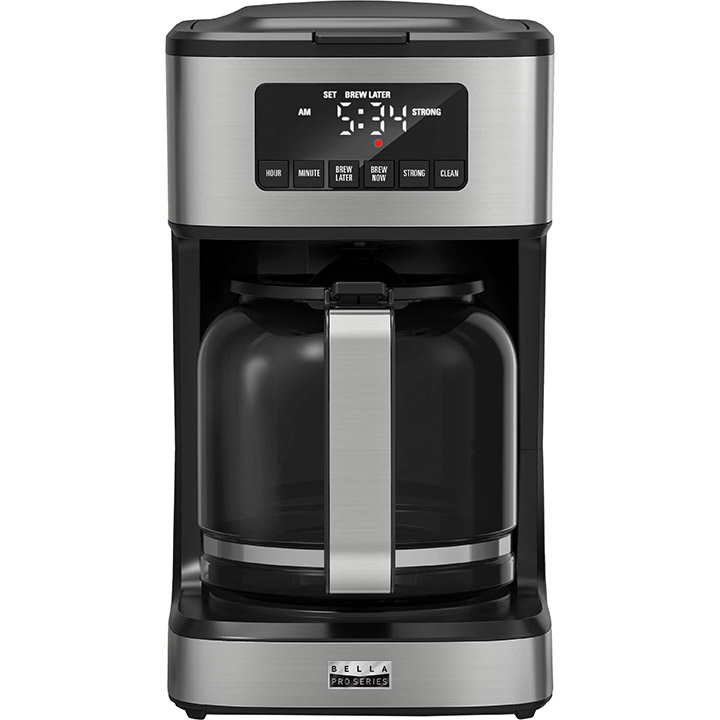 Hot perfectly made coffee brewed every time. Programmable up to 24 hours in advance brew to your taste regular or strong. The large digital LED screen is easy to read and easy to use. Not making a full pot Brew your preferred amount with the help of the viewable water level indicator for easy filling. The pause and serve feature allows you to fill your cup while the rest of the pot is still brewing. Complete with a permanent filter and dishwasher-safe parts and special cleaning cycle for optimal flavor the bella PRO 12-Cup Programmable Coffee Maker will make mornings extraordinary.