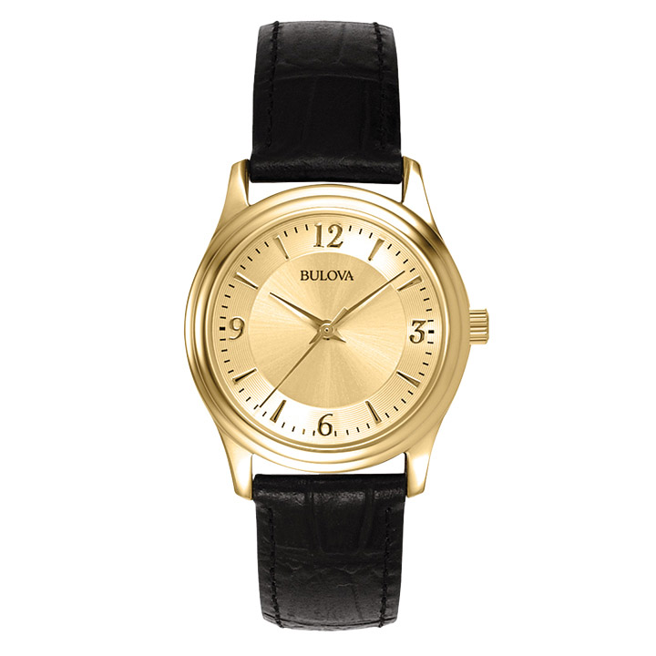 This chic women’s watch has a black leather strap, gold-tone stainless-steel 30mm case, gold-tone gilt dial with Arabic numerals, gold-tone bezel, sweep second hand, and black leather strap. Water resistant to 30M.