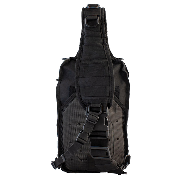 The large black Rover sling pack is made of 600D polyester and has 13L of total storage space, enough for a tablet or a laptop up to 13”, and it has a slip pocket with a touch-fastener closure. The sling pack is equipped with an ambidextrous strap that allows quick closure, two external pockets, and MOLLE webbing platform on the front and shoulder strap for adding gear. Measures 15” x 9” x 9”.