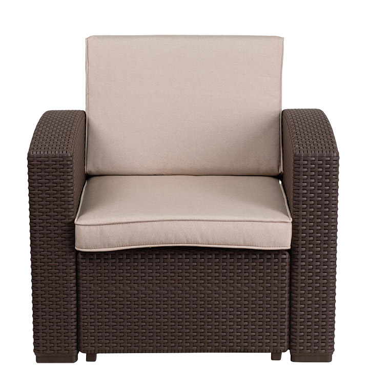 Create an amazing outdoor space with this comfortable and stylish chocolate brown faux rattan patio chair. The durable resin frame offers a stylish appearance and the deep seating guarantees comfort on the included beige all-weather cushions. Dimensions: 32.75" x 32" x 28". Weighs capacity 300 pounds.