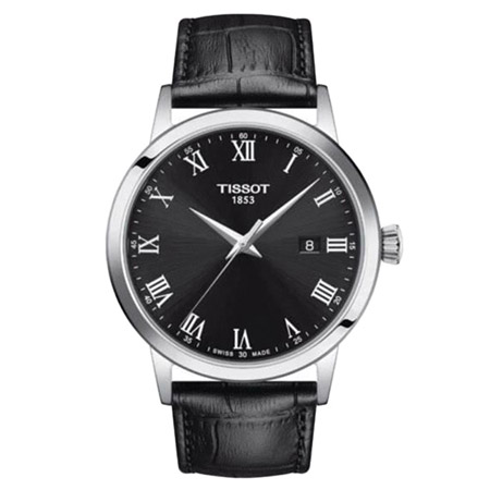 The refined and elegant black-on-black PR 100 dress watch from Tissot comes in a 42mm case made of 316L stainless steel. The dial features Roman numeral hours and a 3 o'clock date window. Set on a black leather strap, this watch will look sleek on your wrist.