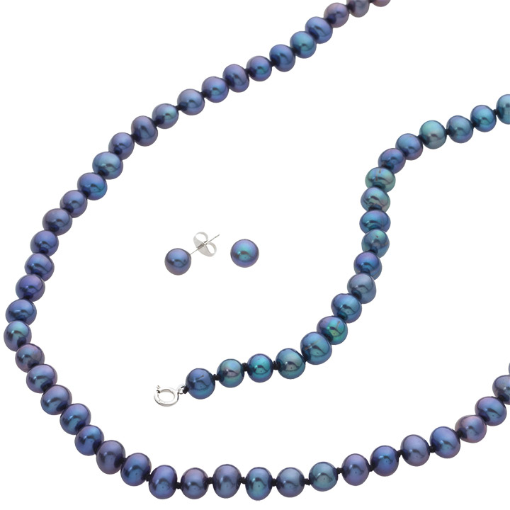 Classic and timeless, this lovely pearl set adds a touch of sophistication to any look. It features 5-6mm black freshwater pearls with sterling-silver filigree clasps. The earrings are secured with post backs, while the bracelet measures 7” and the necklace measures 18”. This is a must-have set for dressing up jeans or a little black dress.