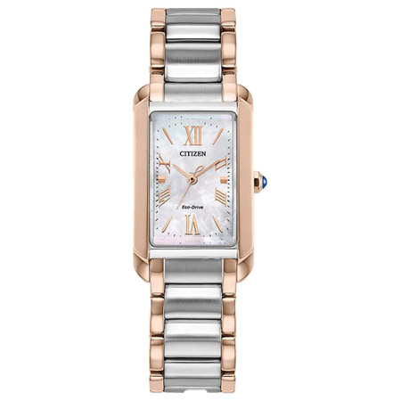 Classic lines and subtle sophistication make the Bianca from Citizen, a charming addition of sustainable luxury. With a design inspired by art deco, the distinctive silver- and rose gold-tone stainless steel timepiece features an elongated case shape and a subtle synthetic sapphire on its crown, creating a captivating look. A curved rectangular shape defines the watch’s 32.4mm silhouette, with a triple link bracelet rounding out the look.
