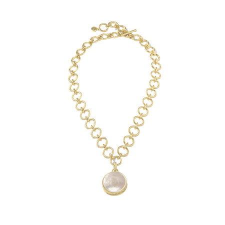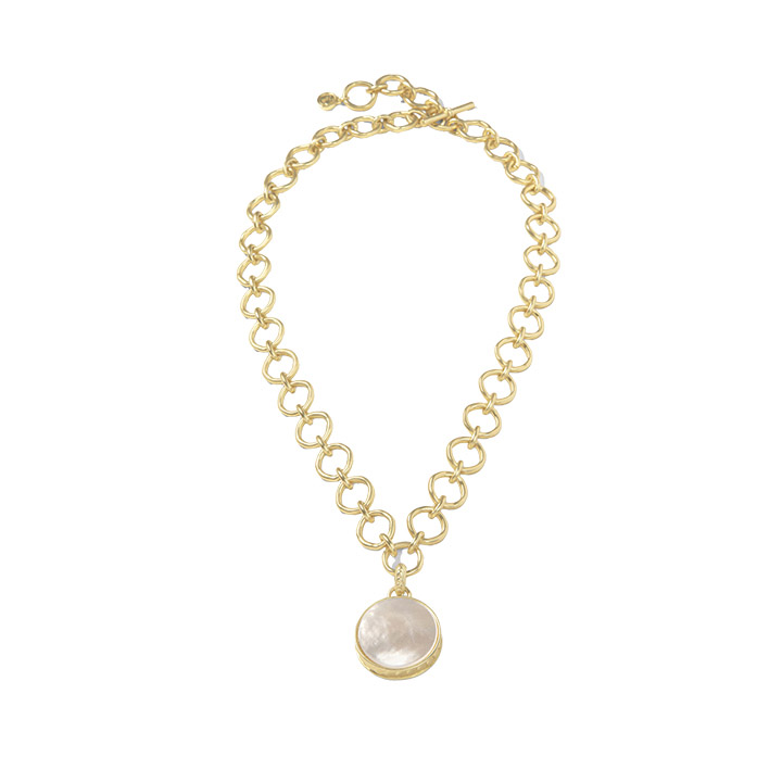 This Naia chunky pearlescent 20” necklace from Spartina 449 is named after a mermaid in long-lost folklore; Naia means “to flow,” which is perfect for this mother-of pearl collection. The 18K matte gold-plated necklace has a semi-precious mother of pearl and adjustable-toggle closure with 20” length.